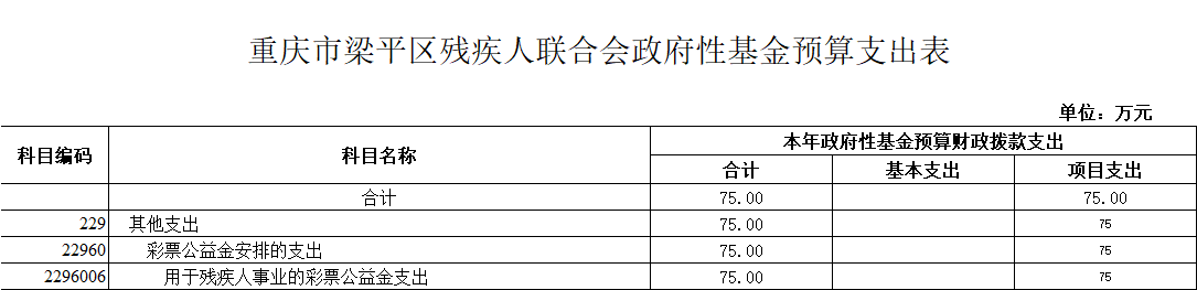 2020年政府性基金預算收入為75萬元,政府性基金預算支出為75萬元,較2019年增加75萬元,主要用于殘疾人其他事業支出。