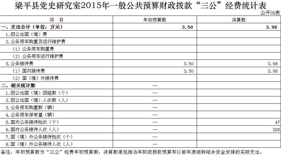 2015年黨史研究室“三公”經(jīng)費(fèi)決算數(shù)為3.98萬(wàn)元,比上年決算數(shù)增加0.48萬(wàn)元,主要原因是今年恰逢紀(jì)念抗戰(zhàn)勝利70周年,我室承擔(dān)了座談會(huì)、宣講等相關(guān)紀(jì)念活動(dòng),卻并未申請(qǐng)專項(xiàng)資金,相關(guān)專家、當(dāng)事人的接待由我室自行承擔(dān)。其中: 我單位2015年無(wú)公車,亦無(wú)因公出國(guó)開支。公務(wù)接待費(fèi)決算數(shù)3.98萬(wàn)元,比年初預(yù)算數(shù)增加0.48萬(wàn)元,主要原因是為紀(jì)念抗戰(zhàn)勝利70周年,相關(guān)接待有所增加。2015年實(shí)際發(fā)生因公接待47批次,265人次,人均接待費(fèi)用0.015萬(wàn)元。