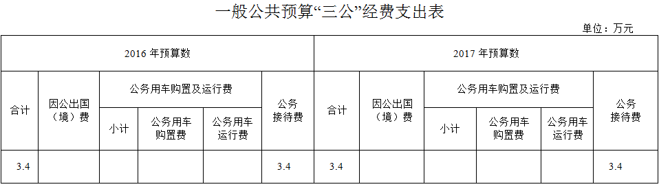 2017年“三公”經費預算3.4萬元,比2016年減少(或增加) 0萬元。其中:因公出國(境)費用0萬元;公務接待費3.4萬元,與2016年持平;公務用車運行維護費0萬元;公務用車購置費0萬元。