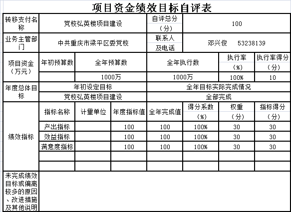 中共重慶市梁平區委黨校弘英樓項目績效目標自評綜述:根據年初設定的績效目標,項目總體完成情況較好,取得了較好的實施績效。項目全年預算數為1000萬元,執行數為1000萬元,完成預算的100%。主要產出和效果:一是產出指標完成情況分析。(1)數量指標。完成了黨校弘英樓項目建設,達成預期目標。(2)質量指標。黨校弘英樓項目建設經檢驗合格,達成預期目標。二是效益指標完成情況分析。社會效益。為全區黨員領導干部、后備干部、公務員和專業技術人員等的繼續教育培訓提供了場所,達成預期目標。三是滿意度指標完成情況分析。服務學員滿意度達到100%,完成了滿意度指標。