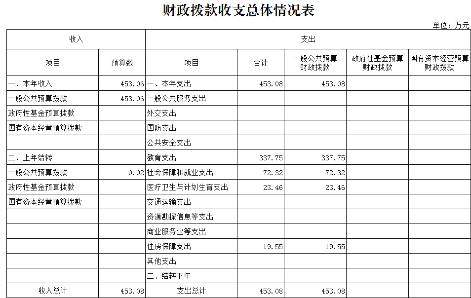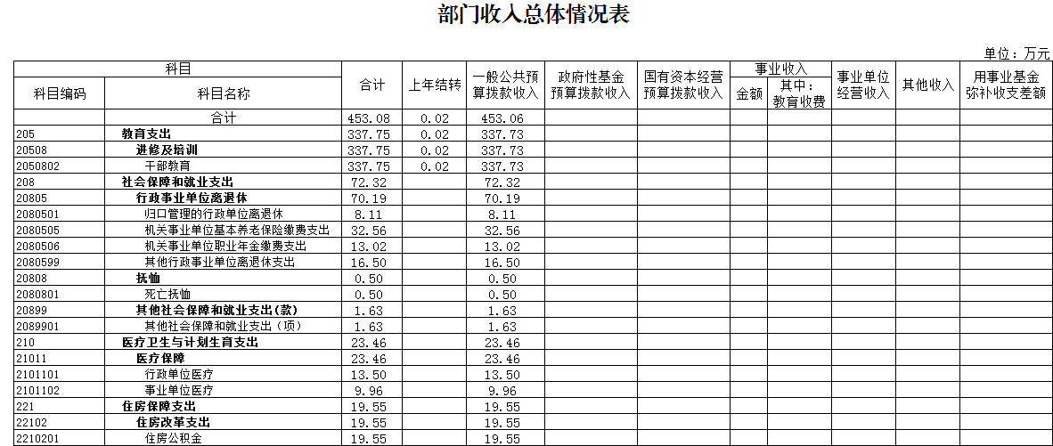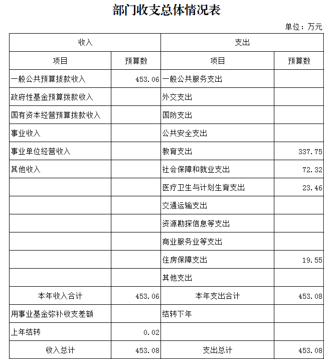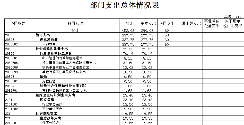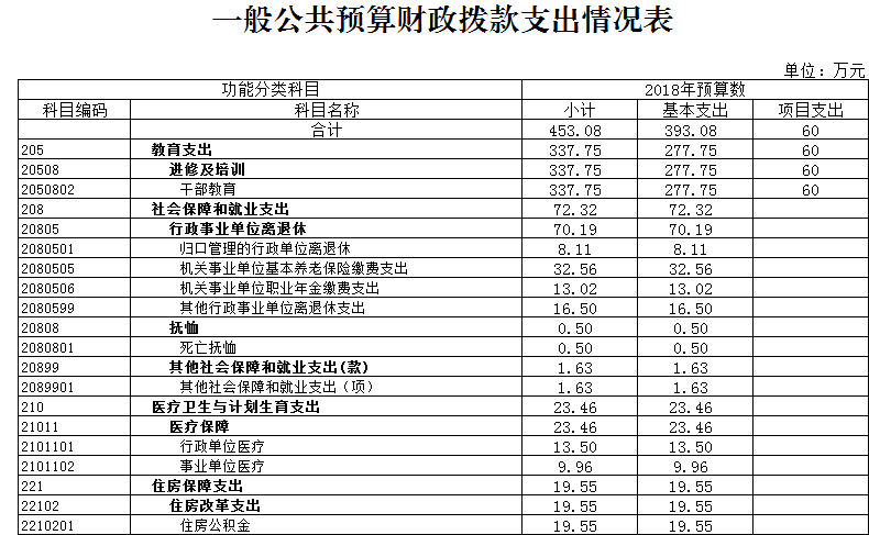 2018年本單位年初預算收入合計453.06萬元。其中,年初預算財政撥款453.06萬元(一般公共預算財政撥款453.06萬元),可支配收入總計453.06萬元。本年支出合計453.06萬元, 按功能分類:干部教育撥款支出337.75萬元;社會保障和就業支出72.32萬元;醫療衛生與計劃生育支出23.46萬元;住房保障支出19.55萬元。本年公共預算基本支出393.08萬元,按經濟分類:工資福利支出313.36萬元,商品和服務支出54.6萬元,對個人和家庭補助支出25.12萬元。本年財政預算撥款項目支出60萬元,主要用于培訓費。總預算收支與2017年相比,主要變化是財政預算撥款增加87.83萬元,其原因:一是2017年期間在職人員工資調標和離退休人員增加離退休費,未納入2018年預算;二是2018年增加年終績效考核獎納入2017年預算;三是機關事業單位基本養老保險繳費及職業年金繳費納入了2018年預算。