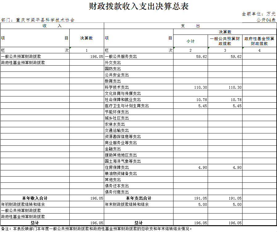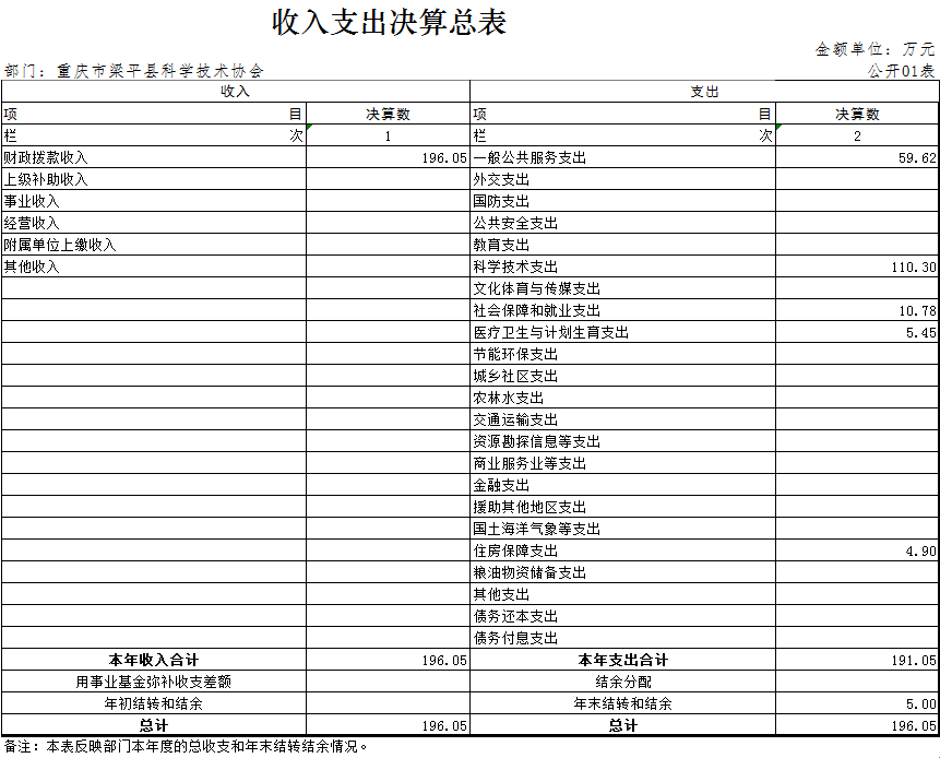 本部門2016年度收入總計196.05萬元,支出總計196.05萬元。與2015年決算數相比,收支增加23.96萬元、增長13.92%,主要原因是因群團改革,增加科普經費。