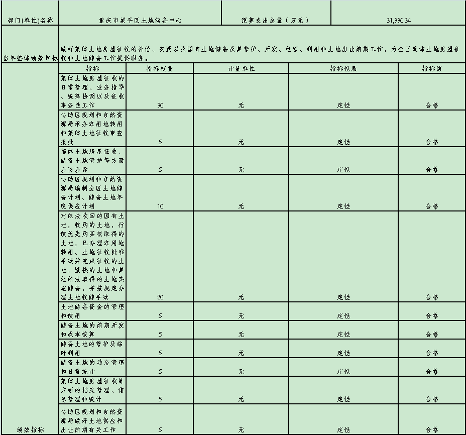 (一)職能職責。重慶市梁平區土地儲備中心的宗旨為集體土地房屋征收和土地儲備工作提供服務。其主要職責任務包括:承擔集體土地房屋征收的補償、安置等具體工作;負責全區國有土地儲備及其管護、開發、經營、利用和土地出讓前期工作。
