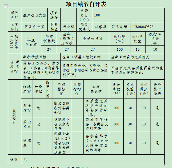 本項目資金的使用充分保障了區委各項會務的有序開展。一年來,在項目的實施過程中工作人員均做到了敬職敬業、及時溝通,得到了領導和參會人員的一致認可。
