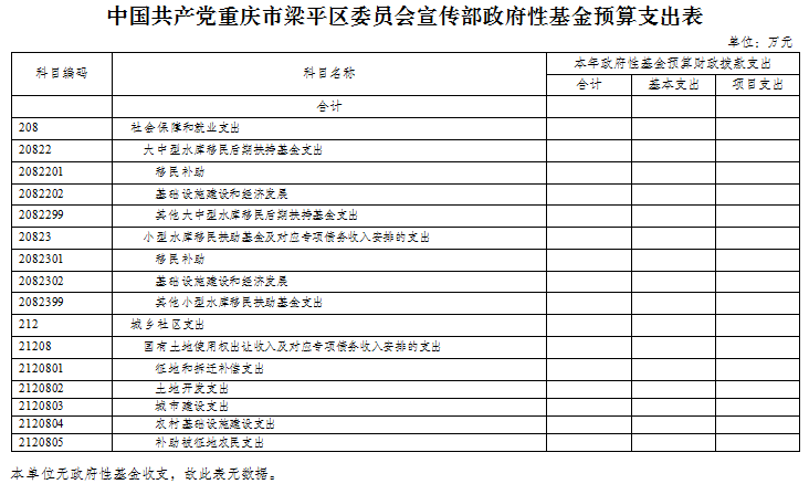 重慶市梁平區委員會宣傳部2019年未使用政府性基金預算撥款安排的支出。