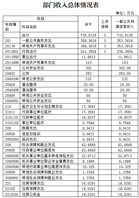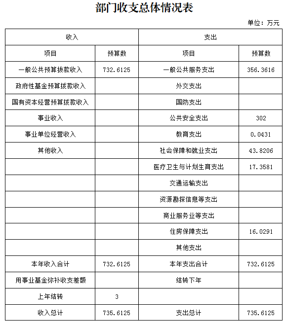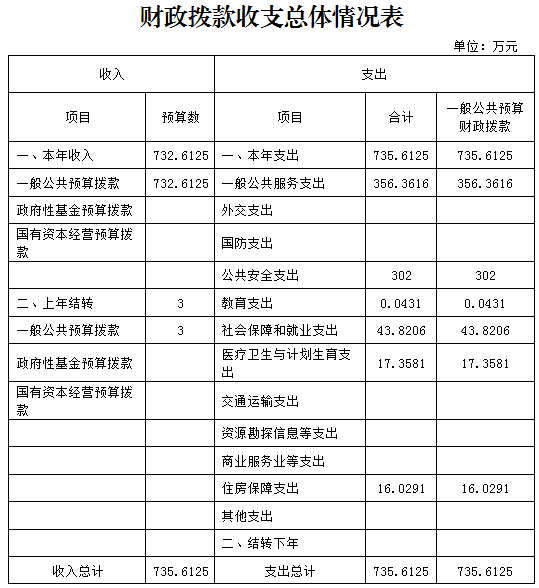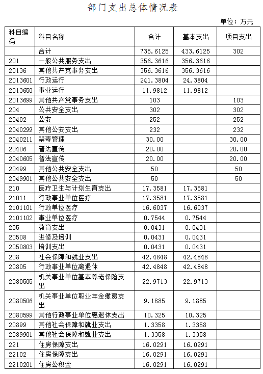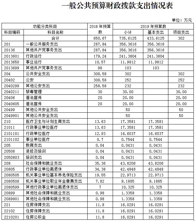 2019年一般公共預算財政撥款收入735.6125 萬元。一般公共預算財政撥款支出735.6125萬元,比2018年增加78.3725萬元。其中:基本支出433.6125萬元,比2018年增加182.9425萬元,主要原因是工作人員的增加,主要用于保障在職人員工資福利及社會保險繳費,離退休人員離退休費,保障部門正常運轉的各項商品服務支出、落實嚴重精神障礙患者監護責任險、鐵路護路工作經費、國安工作經費等;項目支出302萬元,比2018年減少104.58萬元,主要原因是壓減一般性項目開支等,主要用于掃黑除惡專項斗爭、平安建設、社會綜合治理、國安、禁毒、流動人口管理、防邪、等重點工作等重點工作。