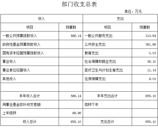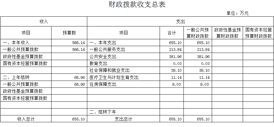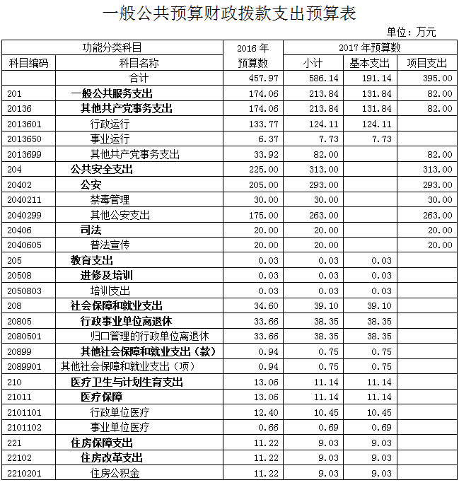 2017年一般公共預算財政撥款收入586.14萬元,上年結余68.96萬元。一般公共預算財政撥款支出655.10萬元,比2016年增加138.13萬元。其中:基本支出191.14萬元,比2016年減少7.91萬元,主要原因是職工工作調(diào)動,主要用于保障在職人員工資福利及社會保險繳費,離退休人員離退休費及生活補助,保障部門正常運轉的各項商品服務支出;項目支出395萬元,比2016年增加146.05萬元,主要原因是工作項目增加,主要用于社會綜合治理、國安、高鐵護路、禁毒、流動人口管理、防邪等重點工作。