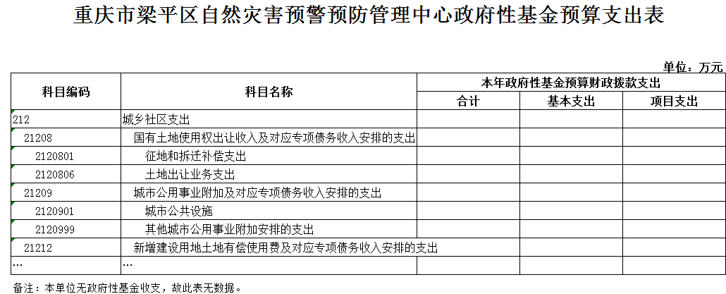 重慶市梁平區自然災害預警預防管理中心2019年未使用政府性基金預算撥款安排的支出。