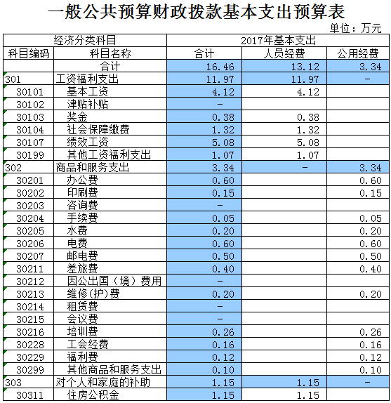 1、部門運行經費(即公用經費)。2017年一般公共預算財政撥款運行經費 3.34萬元,主要用于:辦公費及印刷費、郵電費、維修費和其他商品和服務支出。