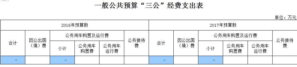 2017年“三公”經費預算 0 萬元,其中:因公出國(境)費用 0萬元,公務用車運行維護費 0萬元,公務用車購置費 0 萬元。