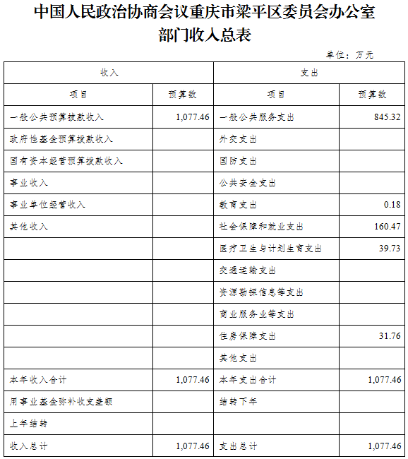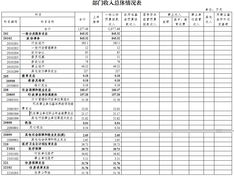 2019年一般公共預算財政撥款收入1077.46萬元,上年結轉0萬元,全年收入共1077.46萬元;一般公共預算財政撥款支出1077.46萬元;2018年一般公共預算財政撥款收入1021.35萬元;2019年一般公共預算財政撥款收入比2018年增加63.81萬元。其中基本支出664.46萬元,比2018年增加3.11萬元,主要原因是行政運行減少41.3萬元,事業運行增加17.6萬元,教育支出增加0.04萬元,社會保障和就業支出增加25.56萬元,行政單位和事業單位醫療增加0.75萬元,住房保障支出增加0.46萬元等;主要用于保障在職人員工資福利及社會保險繳費,離退休人員離退休費及生活補助,保障部門正常運轉的各項商品服務支出;項目支出413萬元,比2018年減少53萬元,主要原因是一般行政管理事務增加了2萬元,參政議政增加了14萬元,其他政協事務支出增加37萬元;主要是增加了政協委員培訓經費和政協委員參政議政活動經費。