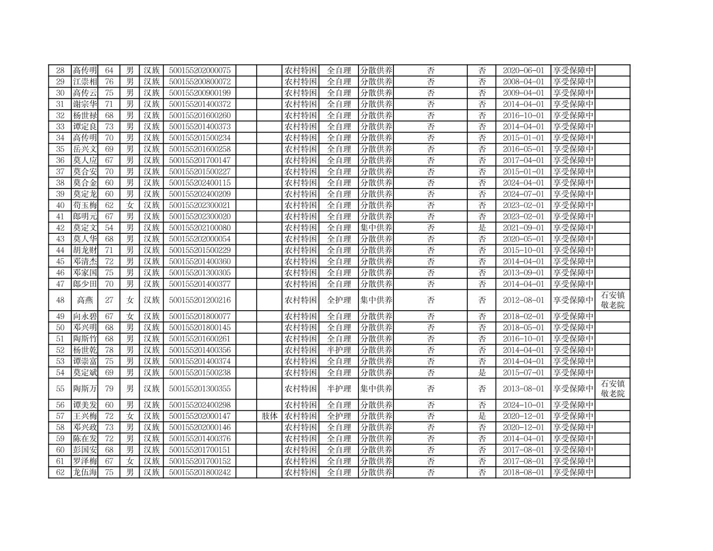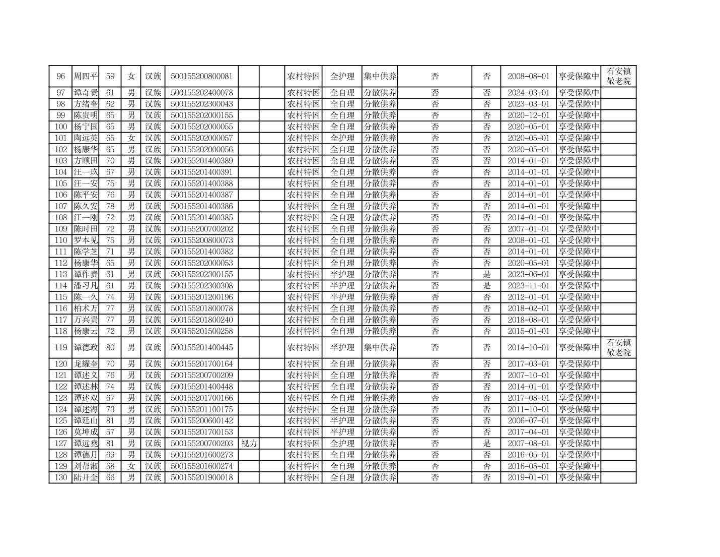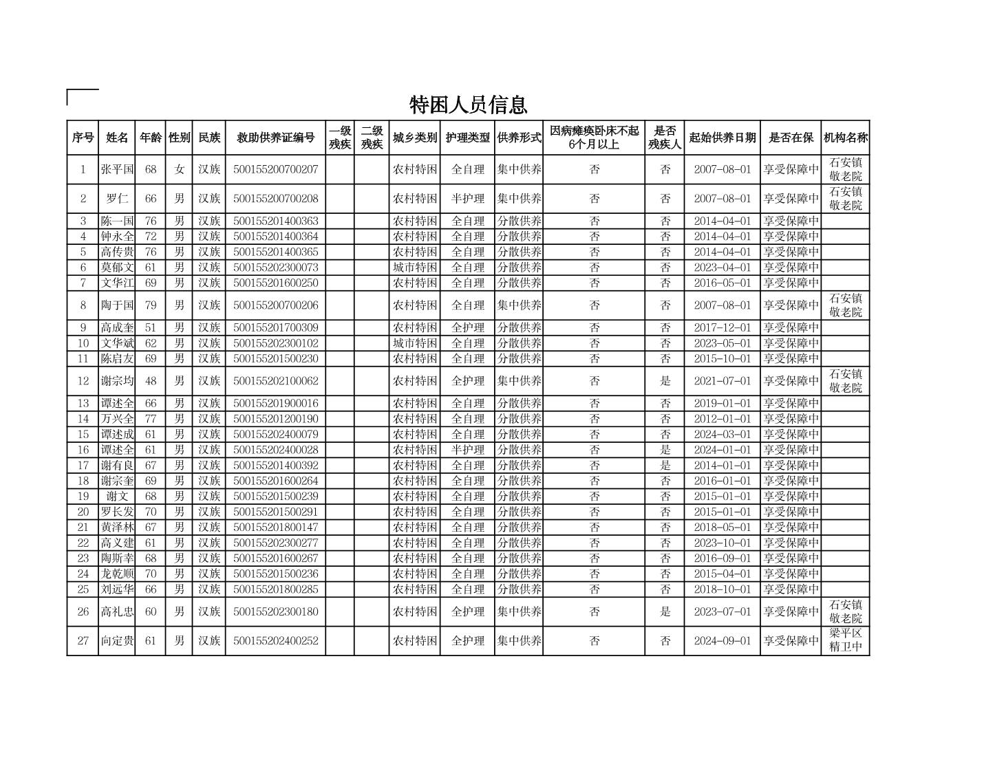 | 標(biāo)題 | 重慶市梁平區(qū)石安鎮(zhèn)人民政府特困人員信息表 | ||
