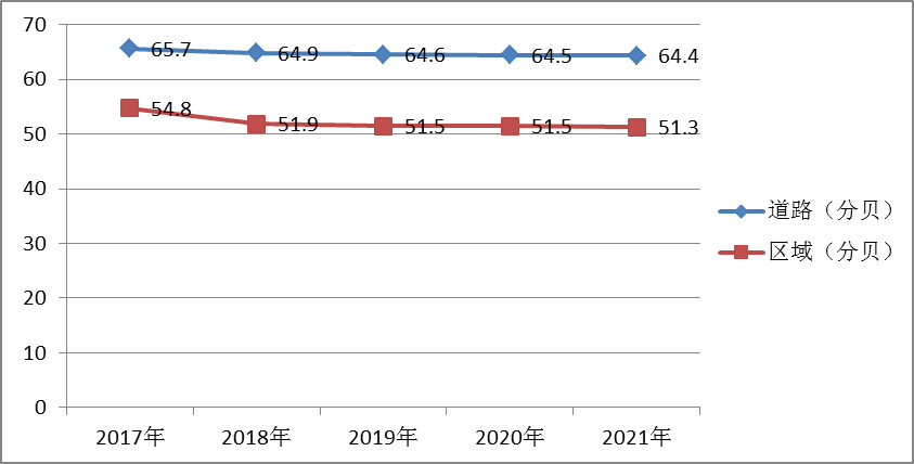 城區區域環境噪聲平均值為51.3分貝,比2020年下降了0.2分貝;道路交通噪聲平均值為64.4分貝,比2020年下降了0.1分貝;功能區噪聲晝間等效聲級57.5分貝,夜間等效聲級47.3分貝。總體來看,聲環境質量保持良好。 近五年梁平城區區域環境噪聲和道路交通噪聲年際變化圖如下: