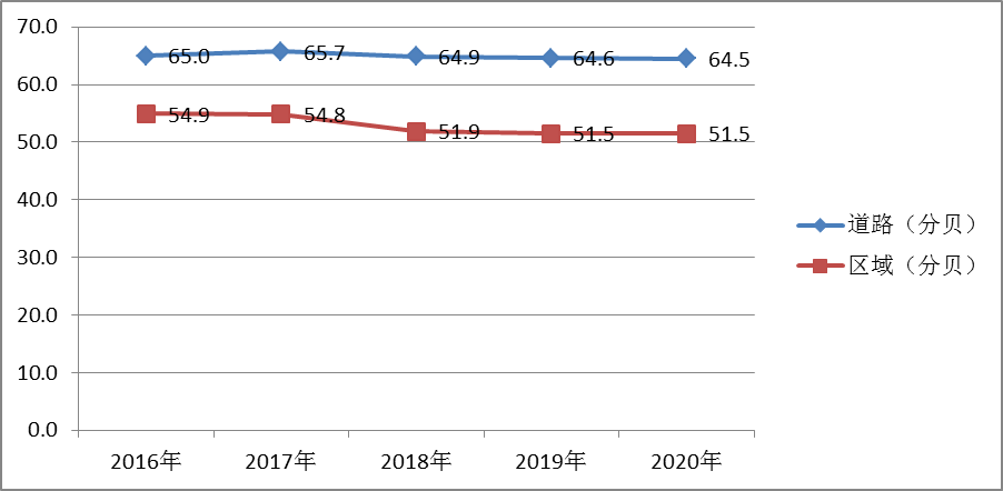 城區區域環境噪聲平均值為51.5分貝,與2019年持平;道路交通噪聲平均值為64.5分貝,比2019年下降了0.1分貝;功能區噪聲晝間等效聲級57.2分貝,夜間等效聲級47.1分貝。總體來看,聲環境質量保持良好。“十三五”期間梁平城區區域環境噪聲和道路交通噪聲年際變化圖如下: