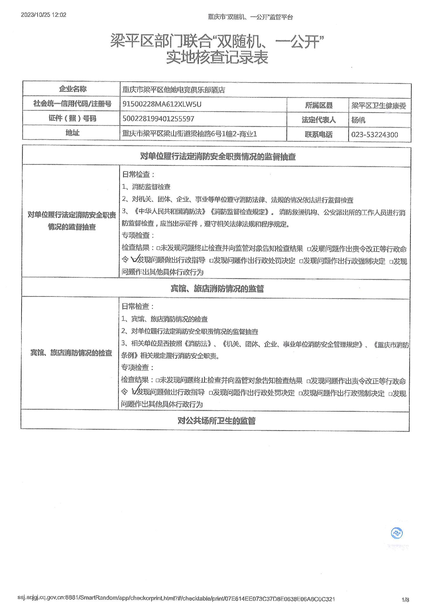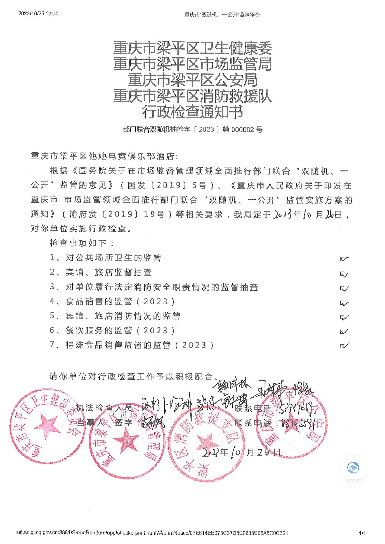 2023年部門聯(lián)合雙隨機檢查結(jié)果公示(梁平區(qū)他她電競俱樂部酒店) |