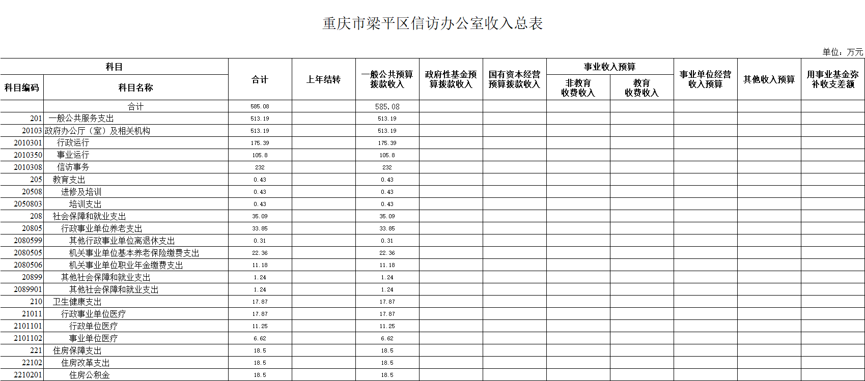 2020年一般公共預算財政撥款收入585.08萬元,一般公共預算財政撥款支出585.08萬元,比2019年減少9.61萬元。其中:基本支出353.08萬元,比2019年減少24.61萬元,主要是2020年預算口徑是以2019年9月單位在職人員基數進行預算,當時我單位調出人員多,調進人員還沒到位。主要用于保障我單位在職人員工資福利及社會保險繳費,退休人員補助等,保障部門正常運轉的各項商品服務支出;項目支出232萬元,比2019年增加15萬元,主要按照渝信辦[2019]44號文件要求,將視頻信訪系統延伸到鄉鎮街道,新增建設資金15萬元。