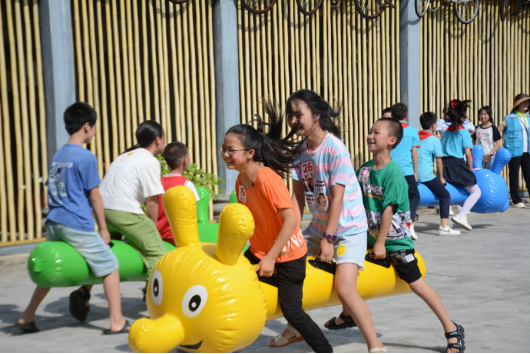 學生志愿者和鄉村兒童一起參加趣味游戲活動。(劉文靜 攝)
