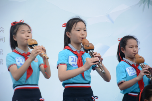 梁平區城西小學的學生志愿者進行葫蘆絲演奏。(劉文靜 攝)