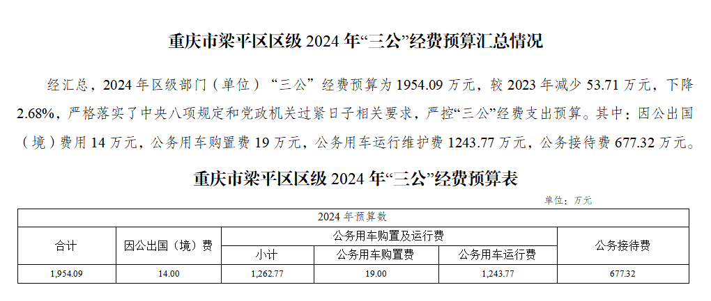 | 標題 | 重慶市梁平區區級2024年“三公”經費預算匯總情況 |
