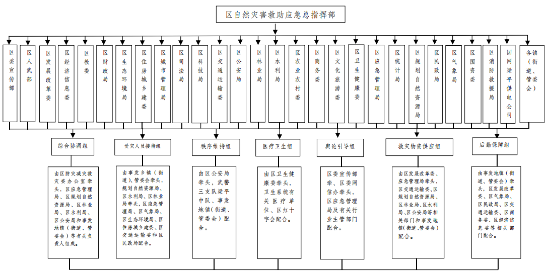 重慶市梁平區(qū)防災(zāi)減災(zāi)救災(zāi)委員會(區(qū)自然災(zāi)害應(yīng)急總指揮部)是區(qū)級自然災(zāi)害救助應(yīng)急指揮、綜合協(xié)調(diào)機(jī)構(gòu),負(fù)責(zé)統(tǒng)籌、組織、領(lǐng)導(dǎo)全區(qū)的自然災(zāi)害救助工作,區(qū)防災(zāi)減災(zāi)救災(zāi)委員會成員單位按照各自職責(zé)做好自然災(zāi)害救助相關(guān)工作。